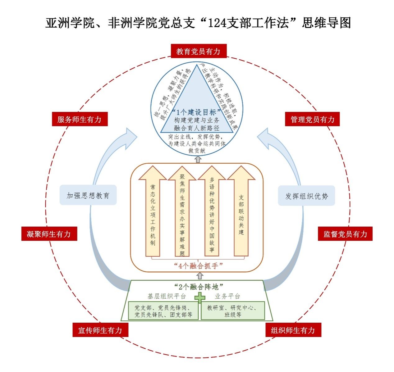 2024年9月,在教育部第三批高校党建示范创建质量创优工作中,beat365英国官网非洲学院第二教师党支部作为全国党建工作样板支部顺利通过验收。在样板支部建设过程中,第二教师党支部创建了“1211工作法”,为支部建设起到了强有力的推动作用。为充分发挥这一工作法的示范效应,牢固树立党的一切工作到支部的鲜明导向,经党总支委员会研究,现制定“124支部工作法”,在四个支部同步实施,力争经过两年的努力,使四个党支部齐头并进,普遍达到“七个有力”建设标准,打造亚非多语种特色党建品牌。