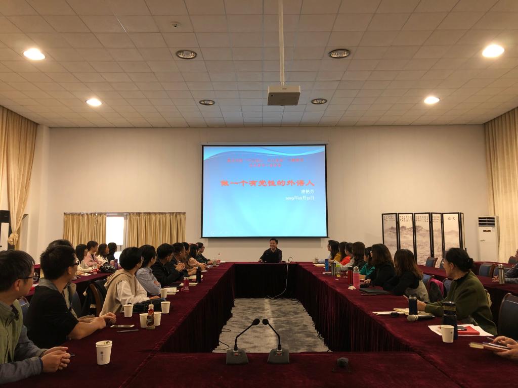 为扎实推进“不忘初心、牢记使命”主题教育活动,进一步贯彻落实“守初心、担使命、找差距、抓落实”的总要求,10月31日下午在学校第六会议室,beat365在线唯一官网院长唐艳芳结合前期学习教育和调研情况,为全院师生党员上了一堂题为“做一个有党性的外语人”的专题党课。全院师生党员到场聆听党课。