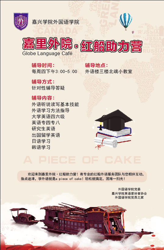 欢迎来到“嘉里外院·红船助力营”!有专业的红船外语服务团队与您相伴互动,指点迷津,学外语就是a piece of cake!轻松就搞定,困难一扫光!