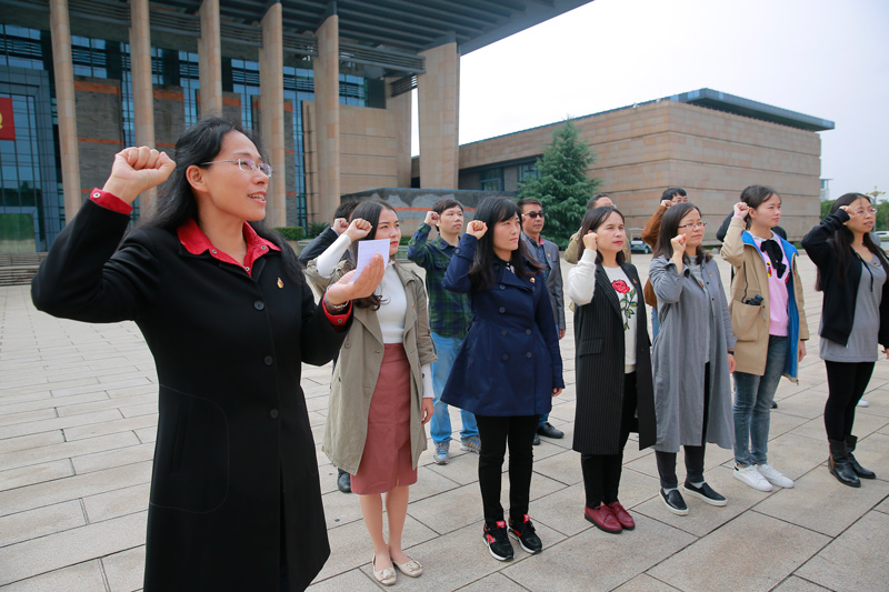10月17日上午,beat365在线唯一官网党委组织师生党员来到南湖革命纪念馆,面向党旗重温入党誓词,以特别的方式迎接党的十九大召开。参加此次宣誓活动的有党委书记陶丹玉、院长唐艳芳、党委副书记周钰、beat365在线唯一官网其他党委委员以及党员老师和部分党员学生。