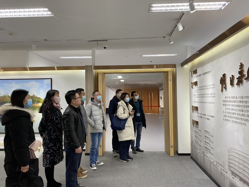 党员教师们首先来到位于图书馆六楼的嘉兴学院办学成果展示馆。结合学校努力建设有特色、善创新的综合性大学的实践历程,以学校“十三五”期间的蝶变跃升、跨越式发展为重点,成果馆集中展示了习近平总书记在浙江工作期间来校视察和致学校建校90周年贺信精神等重要资料。