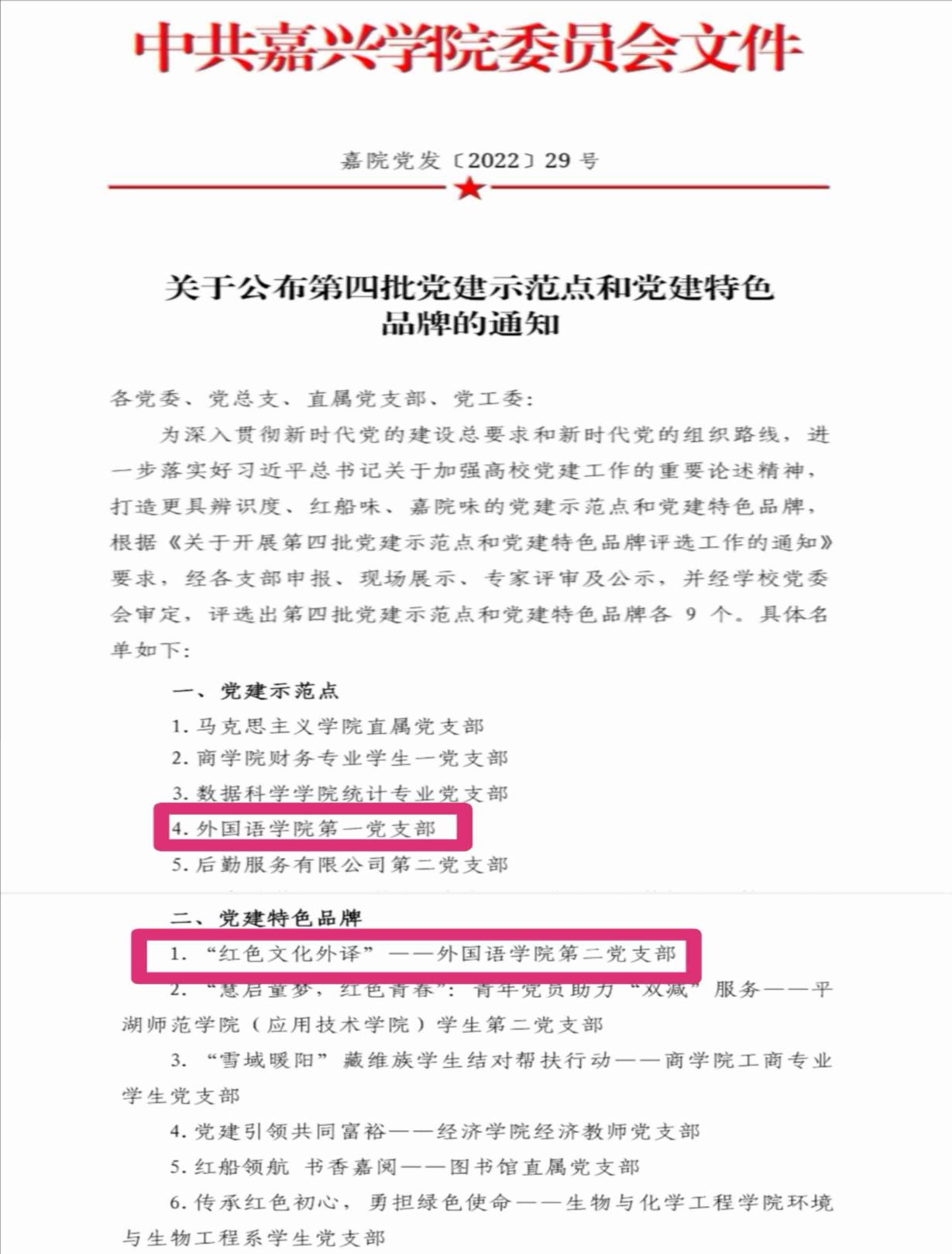 在嘉兴学院2022年10月开展的第四批党建示范点和党建特色品牌评选活动中,beat365在线唯一官网两个党支部一齐登上荣誉榜,第一党支部被评为党建示范点,第二党支部位列党建特色品牌榜榜首。
