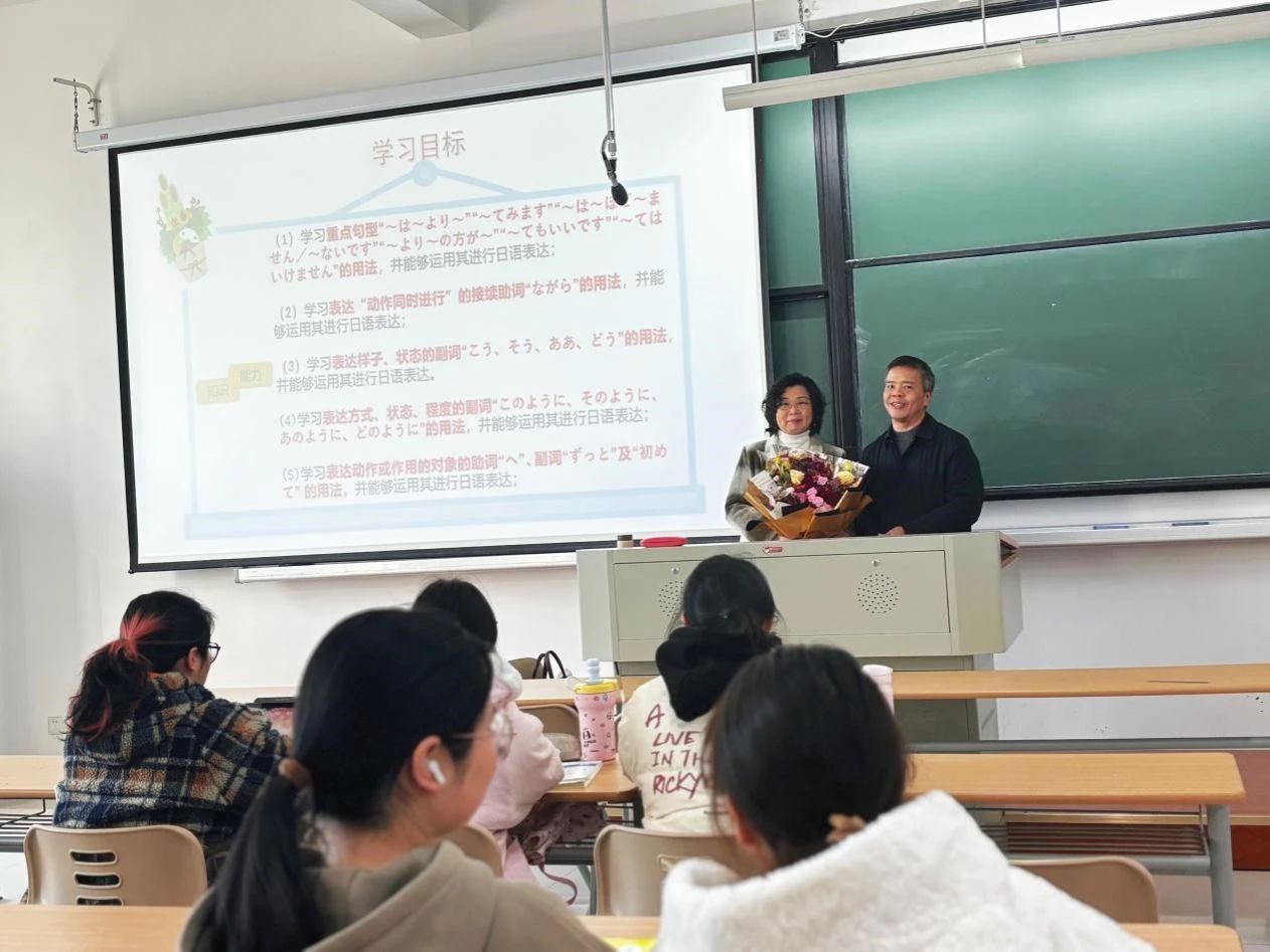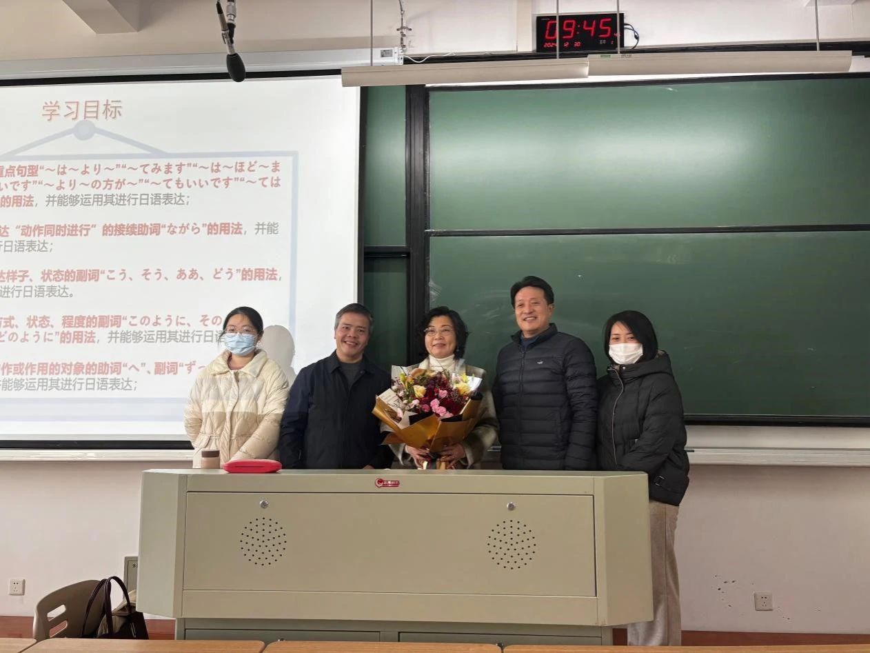 在beat365在线唯一官网的讲台上,有这样一群默默耕耘的身影,他们将青春与热血奉献给了外语教育事业,如今即将告别熟悉的课堂,开启人生新的篇章。2024年12月30日,兴德楼南楼203教室里,上演了一幕感人至深的画面,学院领导亲自为即将退休的教师送上鲜花,在其最后一堂课上,致以最诚挚的敬意与感谢。