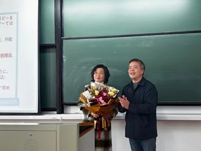 上课铃声准时响起,教室里坐满了全神贯注的学生。就在裴老师准备开始授课时,外院院长唐艳芳、日语专业建设负责人郭永恩、外院教工第三党支部书记陈陆琴、日语系副主任张艳琴,手捧鲜花走进了教室。唐艳芳院长代表学院领导班子发表了热情洋溢且满含深情的讲话,对裴老师在外院工作期间的辛苦付出表示衷心感谢,同时也表达了对裴老师退休后生活的美好祝福。瞬间,教室里响起了热烈的掌声,这掌声饱含着同学们的激动,更传递着大家对老师深深的感激之情。相信对于即将退休的裴艳霞老师,今天的课一定是任教以来最温暖的一堂课。