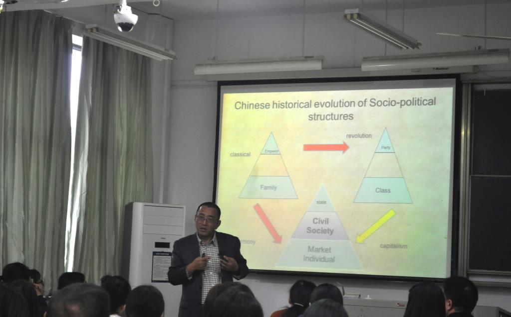 李形教授从文化、政治文化的概念入手,从社会文化学的研究角度对中国政治文化和体制的形成及演变做了仔细解读和梳理。他认为,儒家学说作为中国传统文化的重要组成部分,对包括国家的外交政策、社会人际关系、家庭结构、乃至语言现象等在内的中国社会文化起着至关重要的影响,也成为支撑中国政治体制和政治文化的重要哲学思想基础。与此同时,李形教授从历史的角度对照解读了西方民主政治体制的生发、进展及其特殊历史根源。李教授借用包括韦伯、亨廷顿等在内的西方知名政治经济学家、社会学家的理论解读中西方社会特有的政治体制和文化现象。他指出,中西方政治体制和政治文化有其各自的独特之处,尤其提到中国社会的人文关照、中国传统文化中的兼容并包、宽厚容忍、和谐大同理念,以及浓厚的集体主义和爱国主义情结,是形成中国特色政治文化的重要来源;与此同时,中国政治文化也在中国特色的社会主义体制中体现出自身的特殊优势。