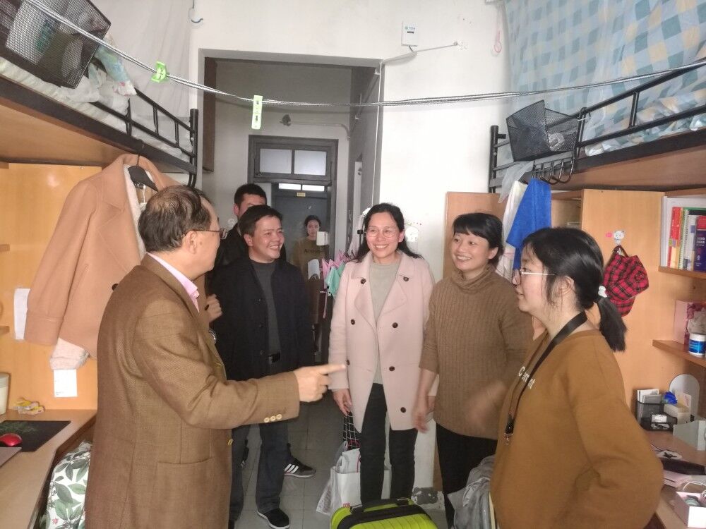 2018年3月4日下午,嘉兴学院副校长费建文在beat365在线唯一官网党政领导班子的陪同下走访学生寝室。