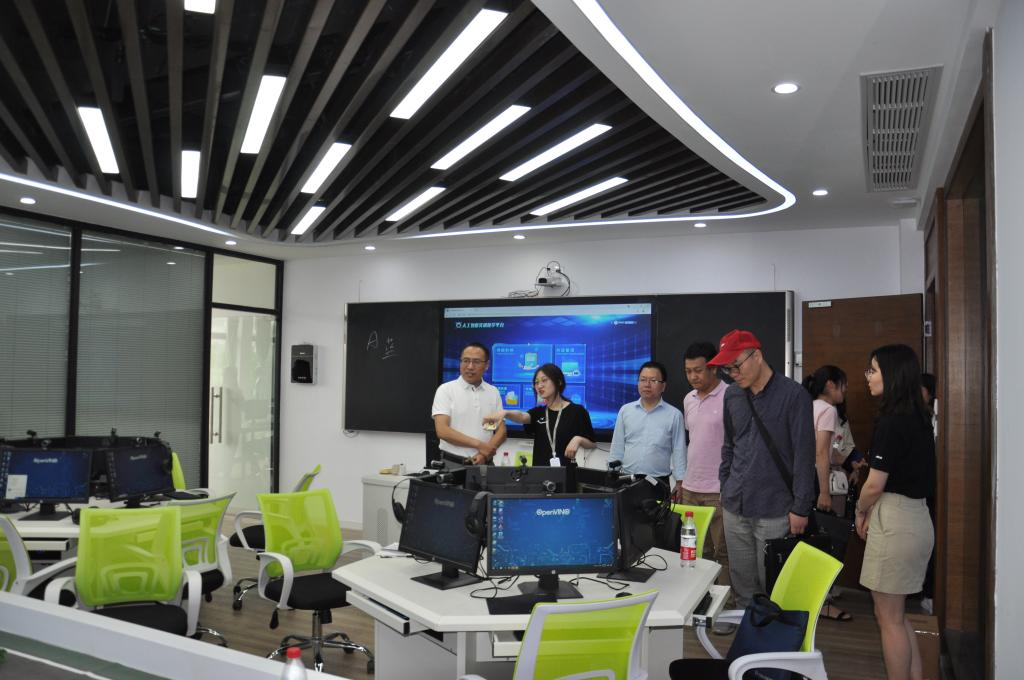 6月4日下午,beat365在线唯一官网一行14名教师在副院长喻锋平带领下前往蓝鸽集团科技公司参观考察,大外部主任、日语系主任、英语系主任和实验室主任全程参与,深入了解蓝鸽集团AI一体化智慧校园解决方案。