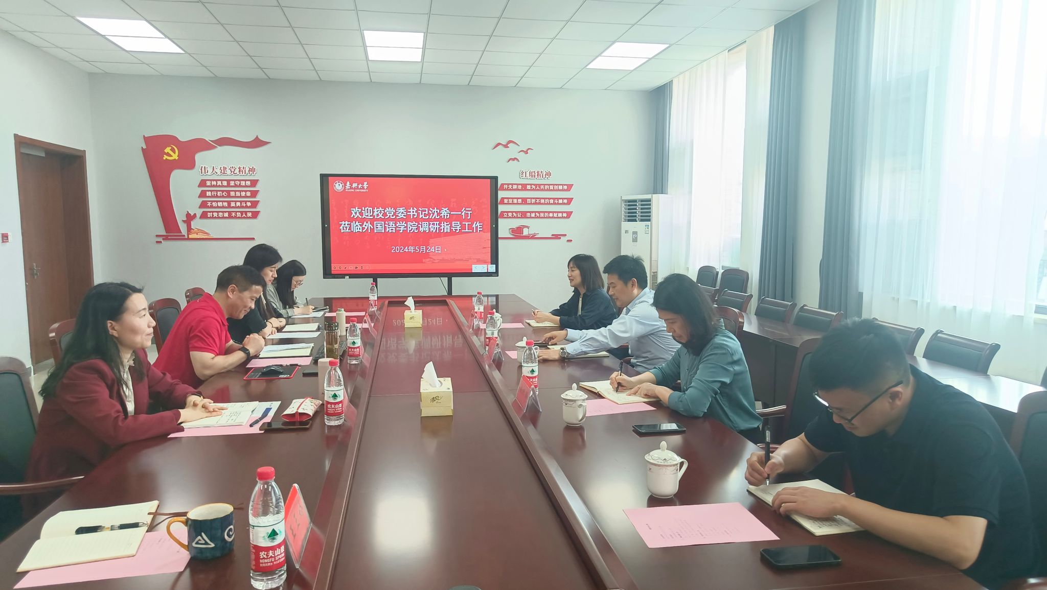 在听取汇报后,沈希充分肯定学院在党的建设、学科建设、人才培养、师资队伍建设等方面取得的成绩。他强调,要以人才培养为中心,加强教育教学改革,提高教师课堂教学水平,提升学生的语言运用能力;要以学科建设为重点,加强翻译硕士学位点建设,以跨学科交叉融合为抓手,不断凝练具有外语特色的学科发展方向;要以新一轮岗位聘任为契机,深入谋划学院发展思路,加强学院体制机制建设,充分调动教职工干事创业的积极性和主动性,不断推动学院有组织高质量发展。