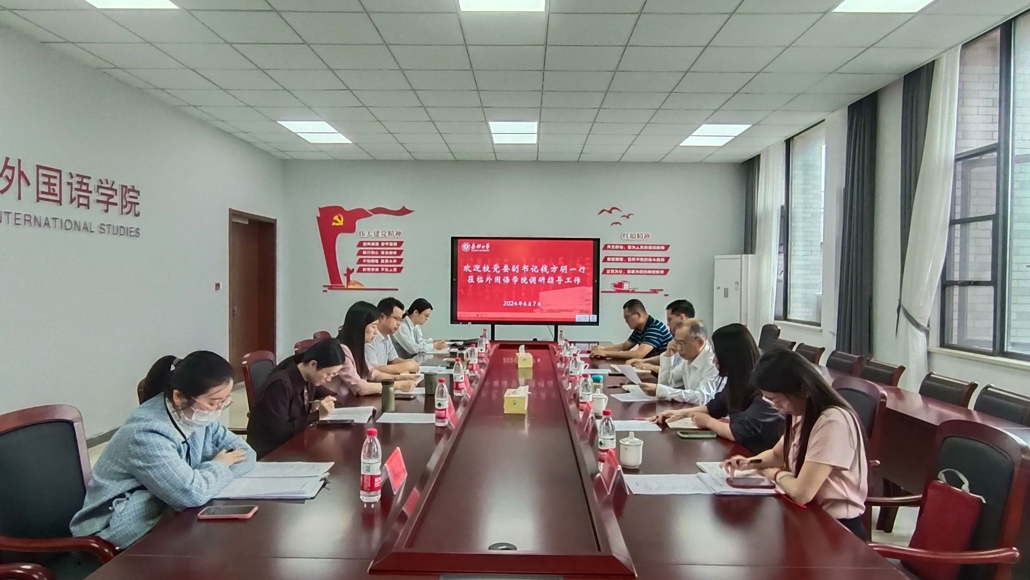 钱方明充分肯定学院在宣传思想及意识形态工作、安全工作、学生工作、团工作中所取得的成效,尤其是学院以党建与学科建设融合、校园文化育人和课程思政建设相结合,擦亮“红色文化外译”党建品牌、赋能立德树人所取得的成绩。针对学院后续发展,他提出具体工作要求:一是要继续加强党建工作品牌建设,依托外语学科特点,不断探索思政育人新模式、构建思政育人新格局,全力以赴做好省级党建标杆院系建设及验收工作;二是要全面落实学生为中心的理念,充分发挥外语专业优势,通过开设特色外语课程、开展中外文化交流活动拓宽学生的国际视野,为学生出国深造提供语言培训服务,全面助推学生成长成才;三是要加强学生工作品牌建设,不断创新学生活动载体、凝练学生工作管理特色,持续推进学生工作品牌建设的常态化、标准化和制度化,不断扩大品牌效应,助力青年学生发展。