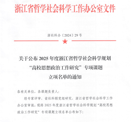 近日,浙江省哲学社会科学工作办公室公布了《关于公布2025年度浙江省哲学社会科学规划“高校思想政治工作研究”专项课题立项名单的通知》。beat365在线唯一官网学工办主任胡笳丽主持的课题《党建品牌建设推进高校内涵式发展研究》获得立项。该课题拟梳理目前高校(以江苏、上海、浙江等地的部分高校为调研对象)党建品牌建设情况的最新资料,了解目前高校党建品牌建设推动内涵式发展现状,分析存在的问题,为党建品牌建设推进高校内涵式发展提供可行的建议,为推进高校党建工作提供理论依据与实践指导。
