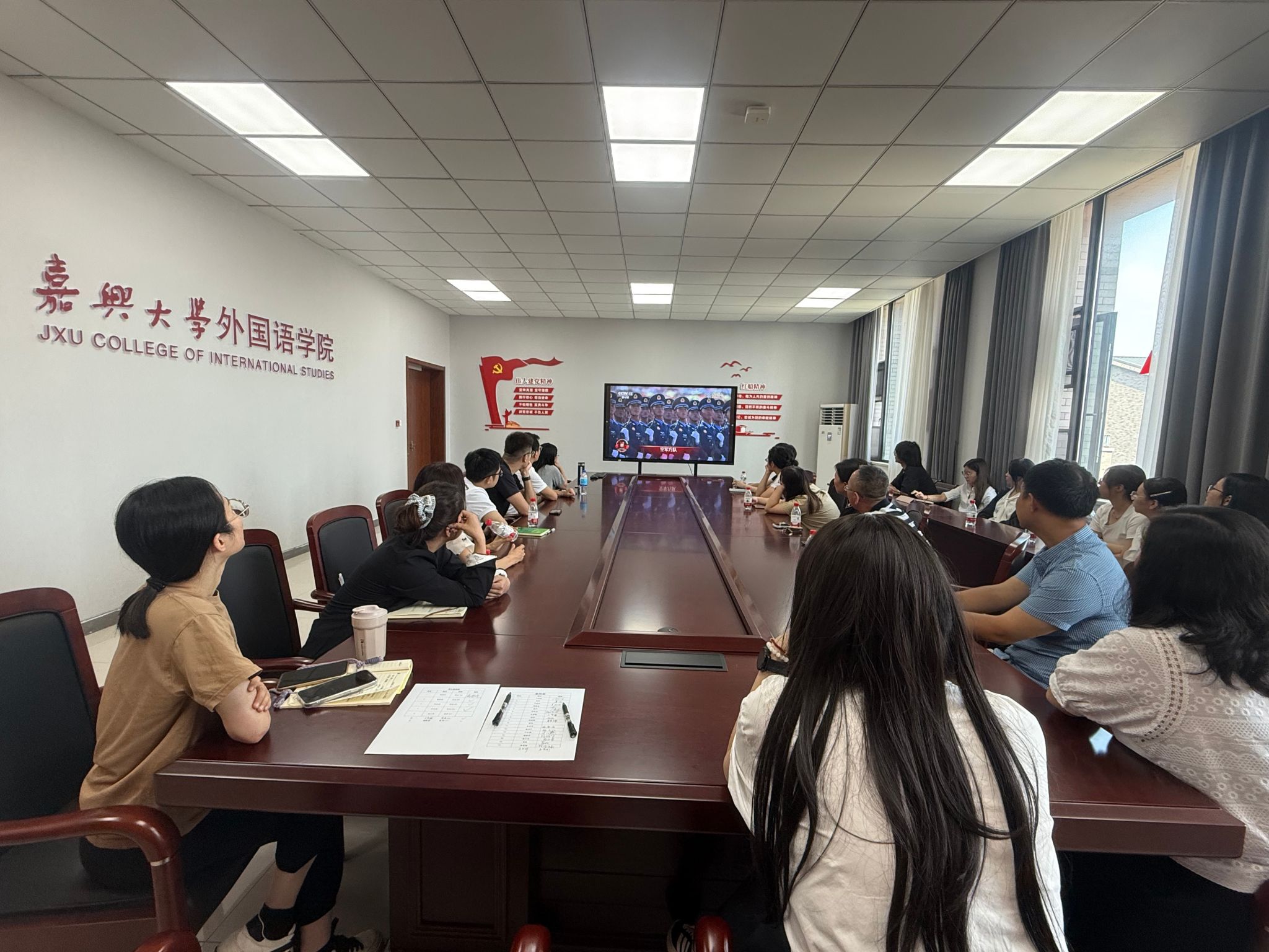 上午9点整,学院系部教师代表、全体行政人员及学生代表共20余人齐聚兴德楼南楼516会议室,共同观看阅兵活动直播。此外,学院还通过系部组织全体教师通过电视、广播、央视新闻、人民网、新华网等官方媒体渠道自行收听收看阅兵活动直播,共同见证这一具有重大政治意义和深远历史意义的国家盛典。